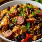 A comforting and hearty dish of black beans and rice enhanced with smoky sausage, bringing together a delightful interplay of flavors and textures.
