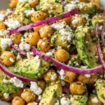 As you step into your kitchen, the air fills with an inviting aroma that blends the earthiness of chickpeas with the vibrant freshness of herbs. Picture a bright green avocado, creamy and ripe, mingling with crumbled feta that adds a tangy richness, all waiting to be brought together in a delectable harmony. The vibrant colors of fresh parsley and mint dance against the warm hues of the chickpeas and the subtle pop of reddish onions. This is not just any salad; it’s a celebration of flavors and textures, a symphony that beckons you to enjoy the goodness of wholesome ingredients.