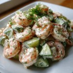 A refreshing and creamy salad featuring succulent shrimp and crisp cucumbers, perfect for a light meal or appetizer.