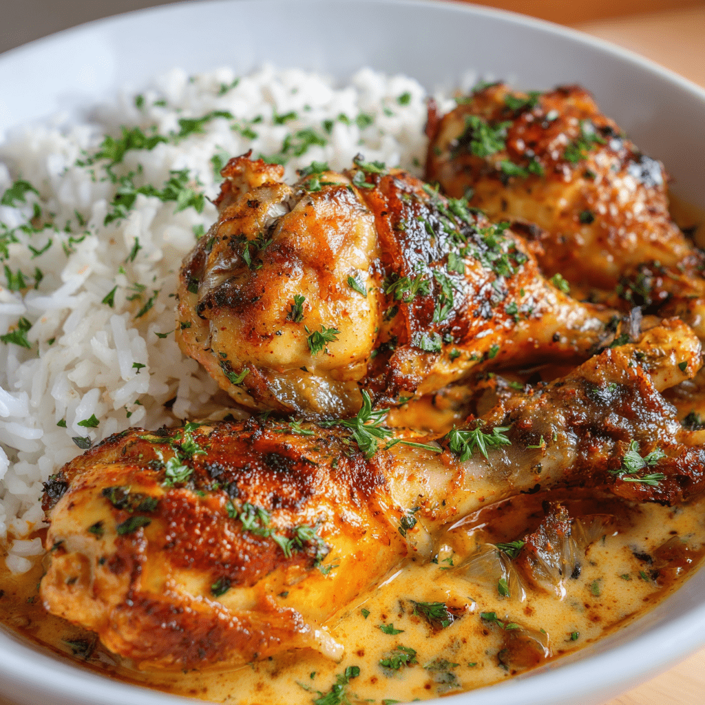 A delicious and creamy dish featuring chicken drumsticks seasoned with paprika, served alongside fluffy steamed rice.