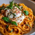 A rich and creamy pasta dish featuring roasted red peppers, heavy cream, and burrata cheese, perfect for a comforting dinner.
