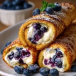 - Roll and Serve: Once cooled, spread cream cheese on each crepe, scatter blueberries, and roll up tightly. Serve immediately.