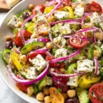 A crisp, refreshing Greek Salad with vibrant vegetables, creamy feta cheese, and a tangy dressing, perfect for summer gatherings.