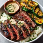 Grilled Steak Bowls with Sauce & Grilled Zucchini Bliss transports you to a sun-kissed barbecue in your backyard, where the smoky aroma of succulent steak mingles with the vibrant scent of fresh zucchini sizzling on the grill. Picture thick, juicy pieces of steak, beautifully charred, the exterior crisp and darkened by the flames, revealing a tender pink inside that yields effortlessly with the slightest pressure of your fork. Each bite bursts with flavor, a harmony of savory and slightly sweet notes, enhanced by the creamy tang of your sauce as it envelops fluffy rice or rich mashed potatoes beneath.