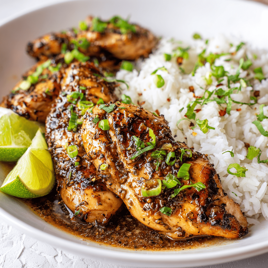 Now for the best part—serving! Place a generous scoop of coconut rice on each plate, then top it with the grilled chicken. Drizzle any leftover marinade over the chicken for extra flavor. Finally, sprinkle chopped green onions on top for a fresh touch. Your Hawaiian Chicken with Coconut Rice is ready to be enjoyed!