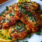 A delightful dish that combines crispy chicken breasts coated in Romano cheese and breadcrumbs with a zesty lemon flavor.