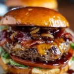 A gourmet burger featuring smoky bacon, juicy beef patties, and a homemade BBQ sauce infused with maple syrup and bourbon, delivering a symphony of flavors.