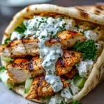 Assemble Your Gyros: Place the sliced chicken into warm pita bread, generously top with feta tzatziki, and garnish with fresh parsley. Serve immediately and savor each bite.