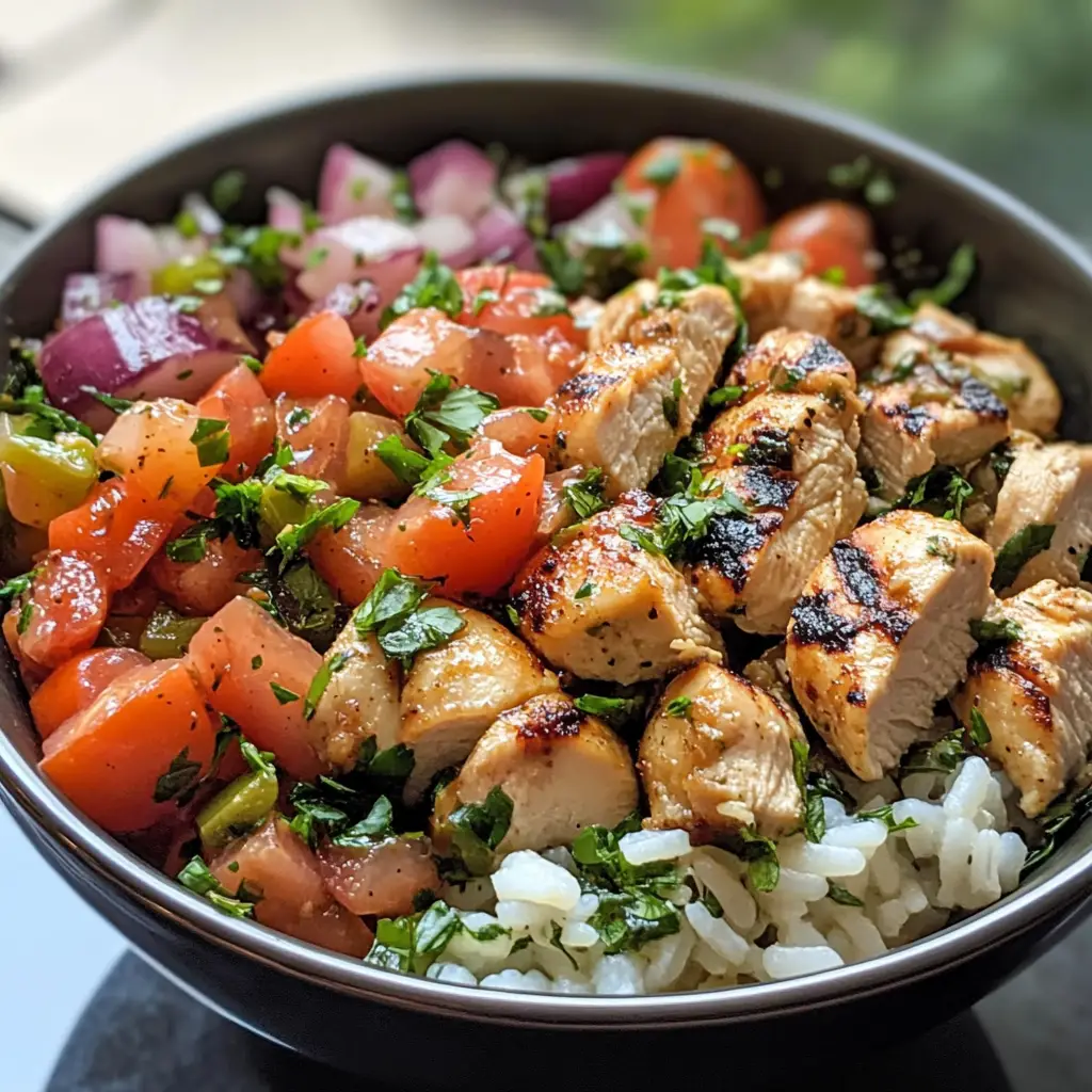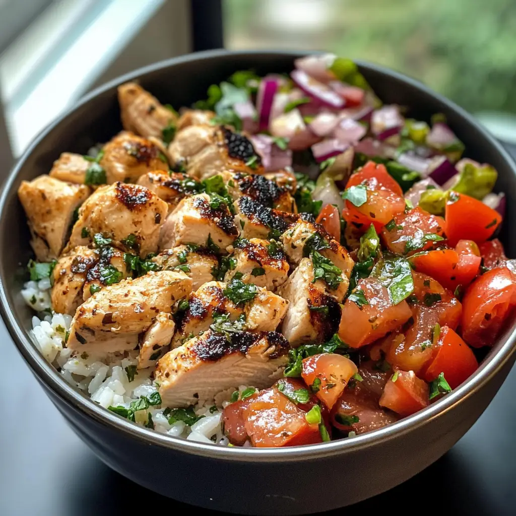 A flavorful Mediterranean Chicken and Rice Bowl that combines tender chicken, aromatic spices, and fresh vegetables over a bed of rice.