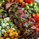Moreover, the Mediterranean Steak Bowl lets you embrace culinary creativity while accommodating diverse dietary preferences with its easily adjustable ingredients. You can skip the feta for a dairy-free option, replace grains with leafy greens for a lighter take, or even omit the steak altogether, replacing it with marinated grilled vegetables or a hearty legume mix for a vegetarian twist. This dish is not just a meal; it becomes a canvas for your culinary imagination.