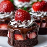 Indulge in these delightful mini cakes with velvety chocolate layers and luscious strawberry filling, perfect for any celebration.