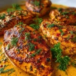A delightful dish featuring seared chicken in a rich, buttery sauce infused with garlic and spices, promising comfort and satisfaction.