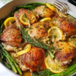 Delight in the flavors of juicy chicken thighs seasoned with lemon and fresh herbs, paired with perfectly roasted asparagus in this easy one-pan recipe.