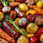 There’s something profoundly comforting about meals that come together effortlessly while encouraging family time. One-Pan Honey Garlic Kielbasa & Veggies is one such dish that radiates warmth and satisfaction. Picture the aroma of garlic wafting through your kitchen, mingling with the sweet, sticky scent of honey as the kielbasa slowly caramelizes, creating a fragrant soundtrack to your evening. Every bite bursts with flavor—the crisp snap of bell peppers, the tender crunch of baby carrots, and the buttery softness of roasted baby potatoes, all perfectly glazed in a glorious honey garlic sauce that cradles the palate like a warm hug.