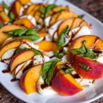 A refreshing salad that combines ripe peaches with creamy mozzarella and fragrant basil, drizzled with balsamic glaze for a delicious summer dish.