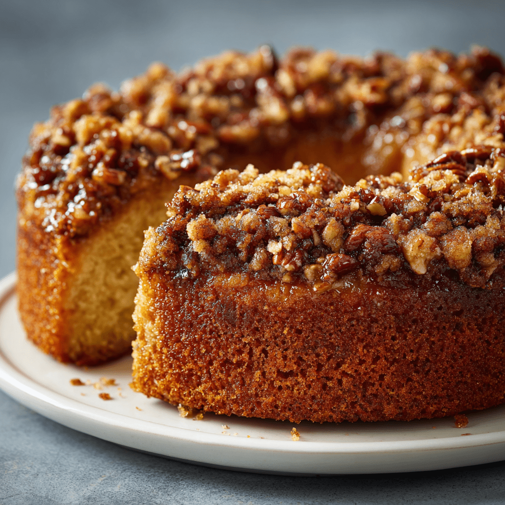 A delicious coffee cake featuring layers of spiced apples and a crunchy pecan topping, perfect for breakfast or dessert.