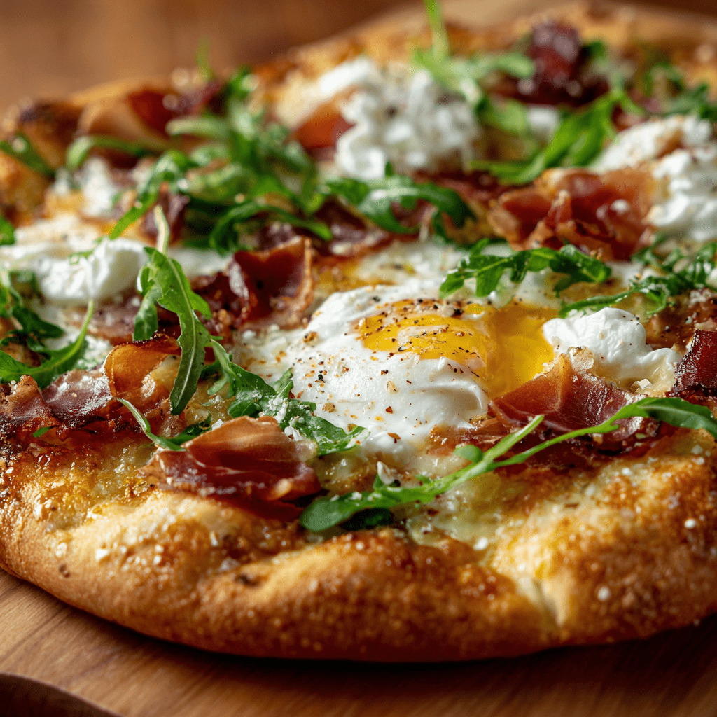A gourmet pizza topped with creamy burrata cheese, savory prosciutto, and a drizzle of honey for a perfect balance of flavors.