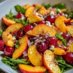 And let’s not forget about the delightful undertones of creamy feta cheese that weaves through the salad, its richness balancing the salad’s bright flavors and providing a savory counterpoint to the peaches’ sweetness. All of this mingles seamlessly with the aromatic dressing of olive oil and balsamic vinegar, a drizzle that enriches the experience with its earthy notes. This salad not only pleases the palate but also creates a colorful and eye-catching presentation—a true feast for the senses that beckons you to dig in.
