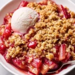 A delightful rhubarb crisp featuring a perfect balance of tartness and sweetness with a crunchy topping.
