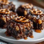 Delicious brownie bites topped with salted caramel and crunchy pretzels, perfect for satisfying your sweet tooth.
