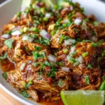 Tender and flavorful chicken carnitas cooked in a slow cooker, perfect for tacos, burritos, or nachos.