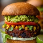 A hearty and flavorful spiced black bean burger topped with a creamy avocado blend, perfect for casual dinners or summer barbecues.