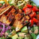 Prep the Base: In a large mixing bowl, combine your mixed greens, diced avocado, halved cherry tomatoes, thinly sliced red onion, cucumber slices, and chopped cilantro. Toss gently to combine without bruising the avocado.