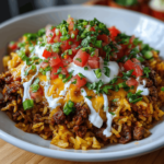 Finally, it’s time to serve! Spoon the taco rice mixture into bowls and top with shredded lettuce, cheese, sour cream, cilantro, and avocado slices. Each topping adds a unique flavor and texture, making every bite a delightful experience. Enjoy your taco rice bowl with family or friends, and watch it disappear!