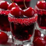 Celebrate with these delightful Twisted Cherry Shots, featuring cherry vodka and lemon-lime soda, garnished with fresh cherries and shimmering red sugar.